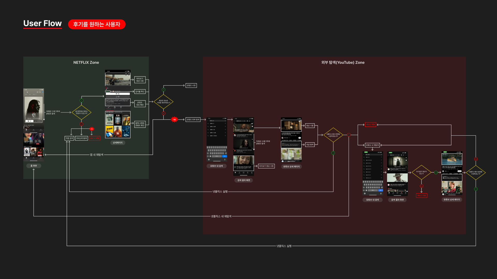 외부 탐색 시 사용자에게는 상황에 따라 몇가지의 선택지가 생긴다. 특히 유튜브 리뷰 같은 경우는 전 시리즈를 요약하거나, 재미있는 장면만 편집한 영상들이 많기 때문에 하나의 콘텐츠로써 소비해서 만족하게 되면 더욱 넷플릭스로의 재유입을 기대하기는 어렵다는 점에서 후기 기능을 추가하여 타인의 의견을 듣고 싶은 욕구를 충족시켜 최대한 이탈을 막는 것을 우선순위로 두고 유저플로우를 만들었다.