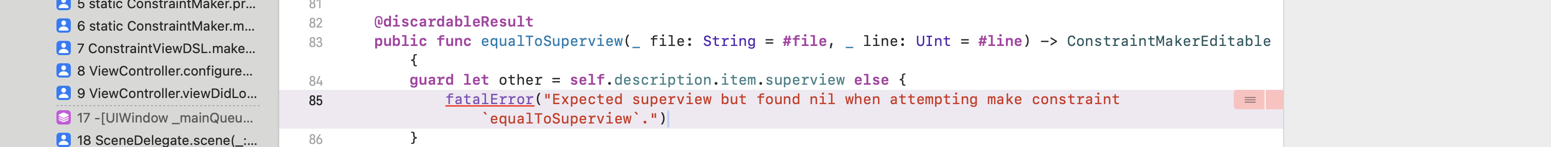 fatalError("Expected superview but found nil when attempting make constraint `equalToSuperview`.")
